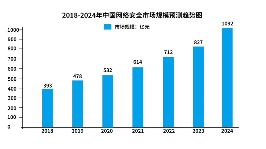當前,網(wǎng)絡安全戰(zhàn)略已成為各國競爭與發(fā)展戰(zhàn)略的重要一環(huán),我國網(wǎng)絡安全政策環(huán)境也在持續(xù)優(yōu)化,加上企業(yè)和個人數(shù)字化需求不斷攀升,我國網(wǎng)絡安全市場持續(xù)擴大。根據(jù)中國網(wǎng)絡安全產(chǎn)業(yè)聯(lián)盟數(shù)據(jù),2022年我國網(wǎng)絡安全市場規(guī)模約712億元,預計未來增速仍將保持在15%以上,到2024年市場規(guī)模將達到1092億元。